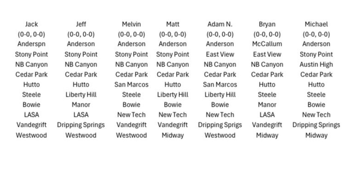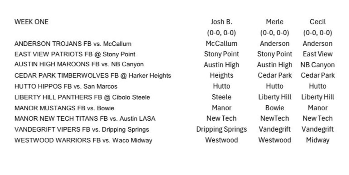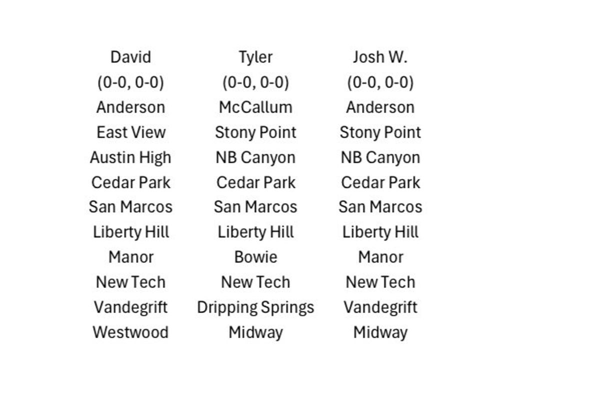 So, this year, we’re gonna take it public. Each week, the PxP guys and/or producers from our Austin crews will attempt to pick the winner of every Austin-area game we’re broadcasting on VYPE Live.